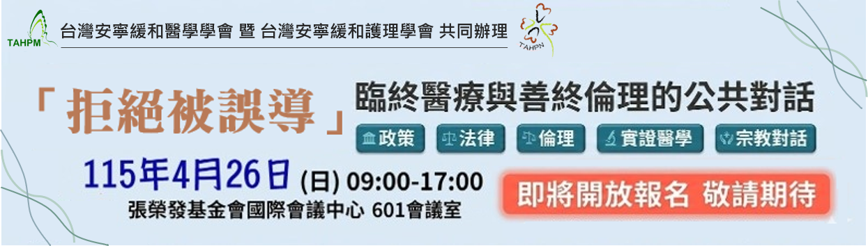 | 【最新立場聲明】台灣安寧緩和醫學學會關於所謂「斷食善終」議題之立場聲明 | 114/04/11 |