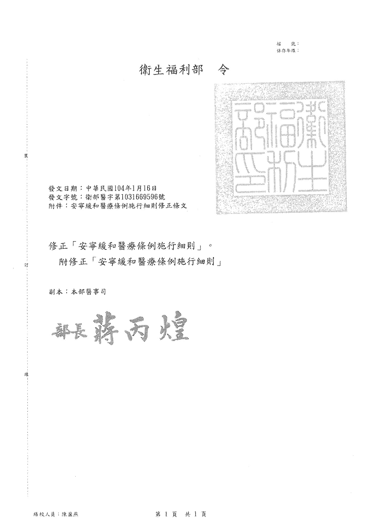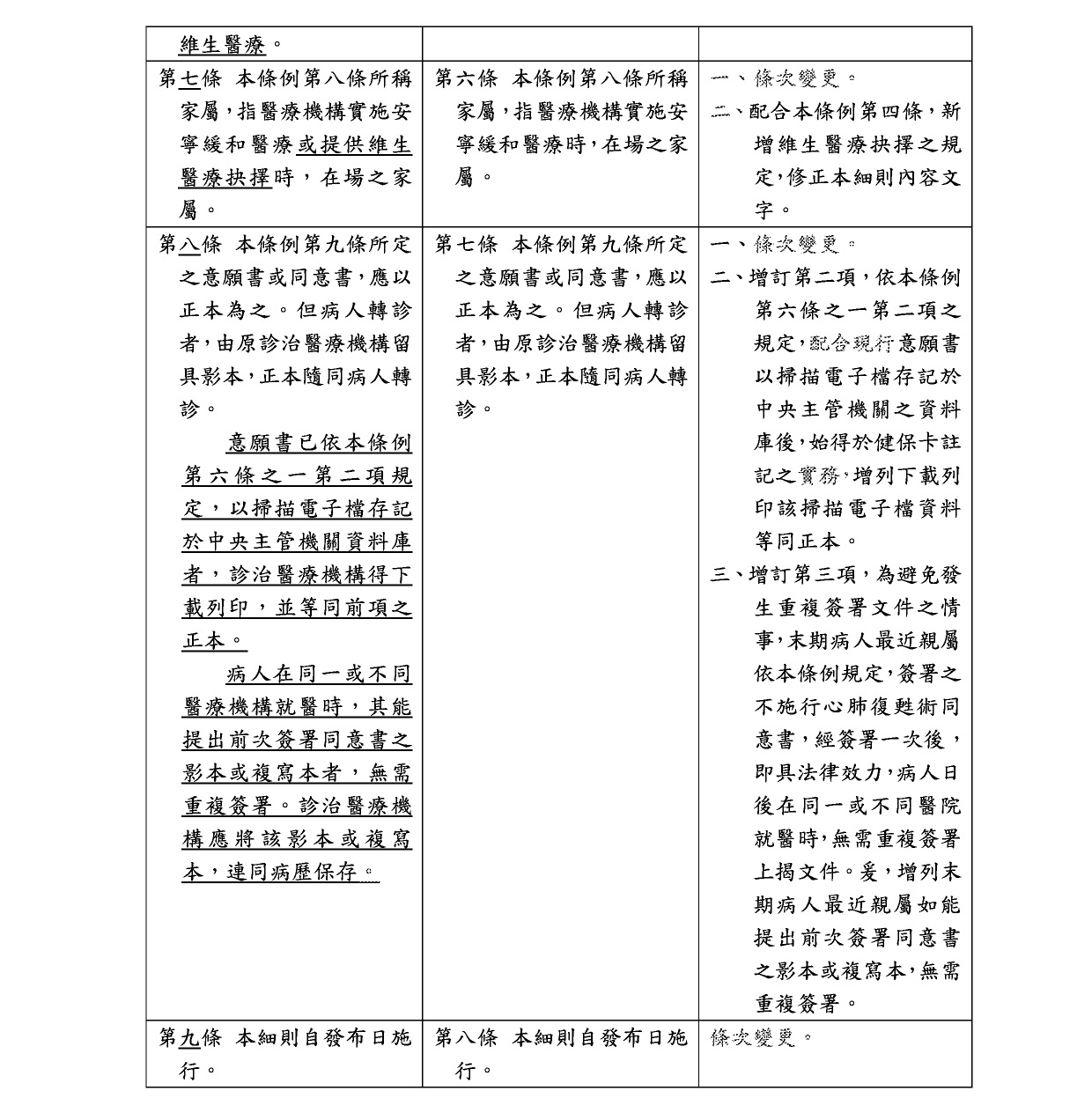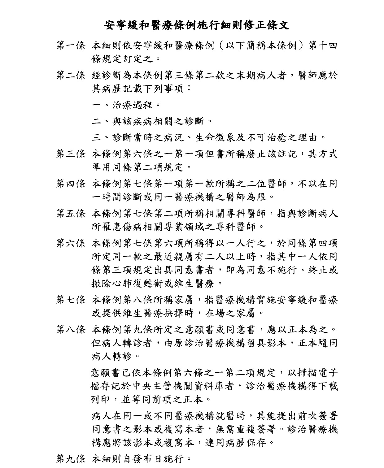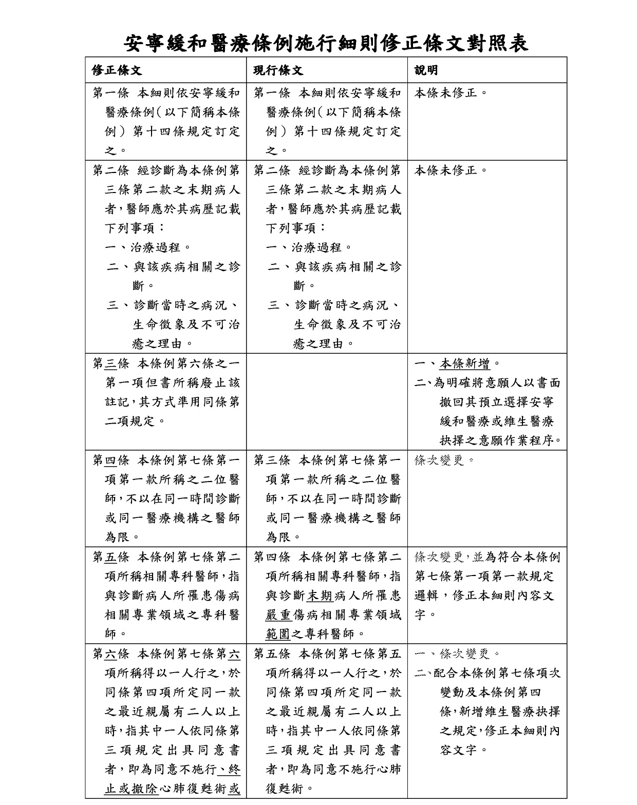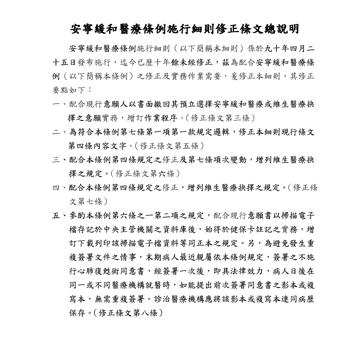 安寧緩和醫療條例施行細則修正條文總說明及修正條文對照表