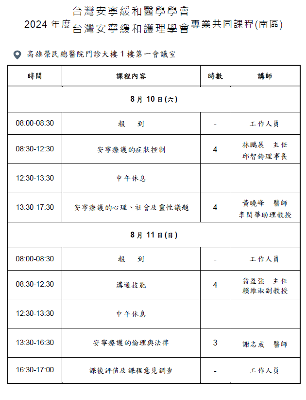 【課程表&交通資訊】安寧緩和醫學專業團隊共同課程-南區(8/10-11)