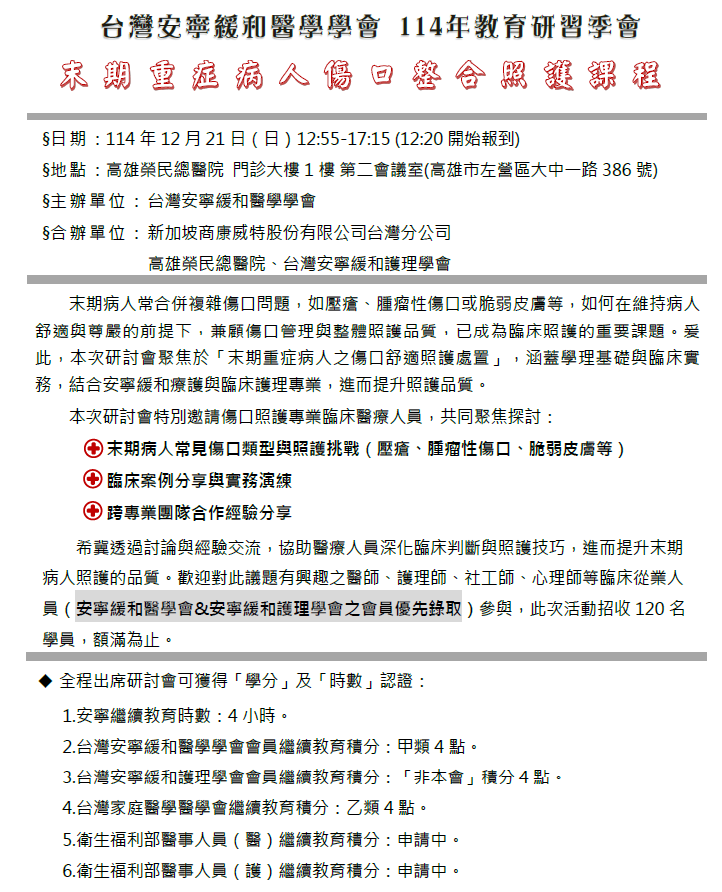 114年教育研習季會|末期重症病人傷口整合照護課程